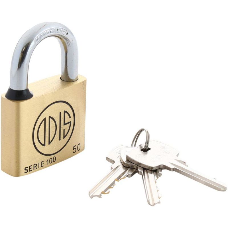 Candado 50Mm 150 Economico Odis. La Serie 100 de Odis es fabricada con cuerpo de bronce extruido reforzado y con un gancho resistente a los cortes de sierra y napoleón.
