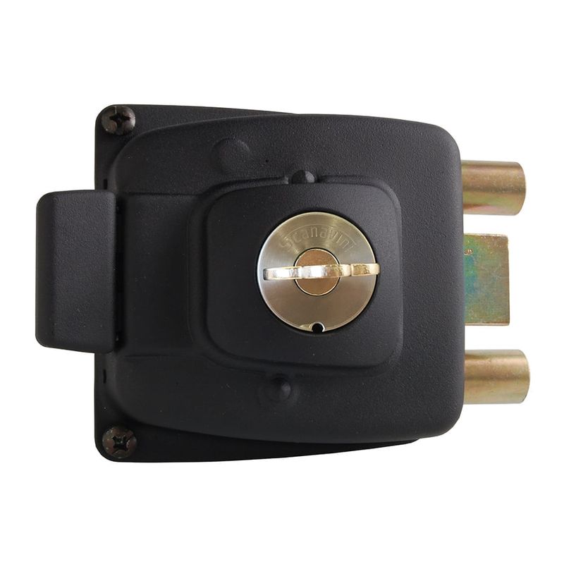 Cerradura Sobreponer Negra P/Metal 2002+30.N Scanavini de sobreponer mecánica para rejas, seguridad o bodega. Picaporte reversible y cerrojo de dos pitones.