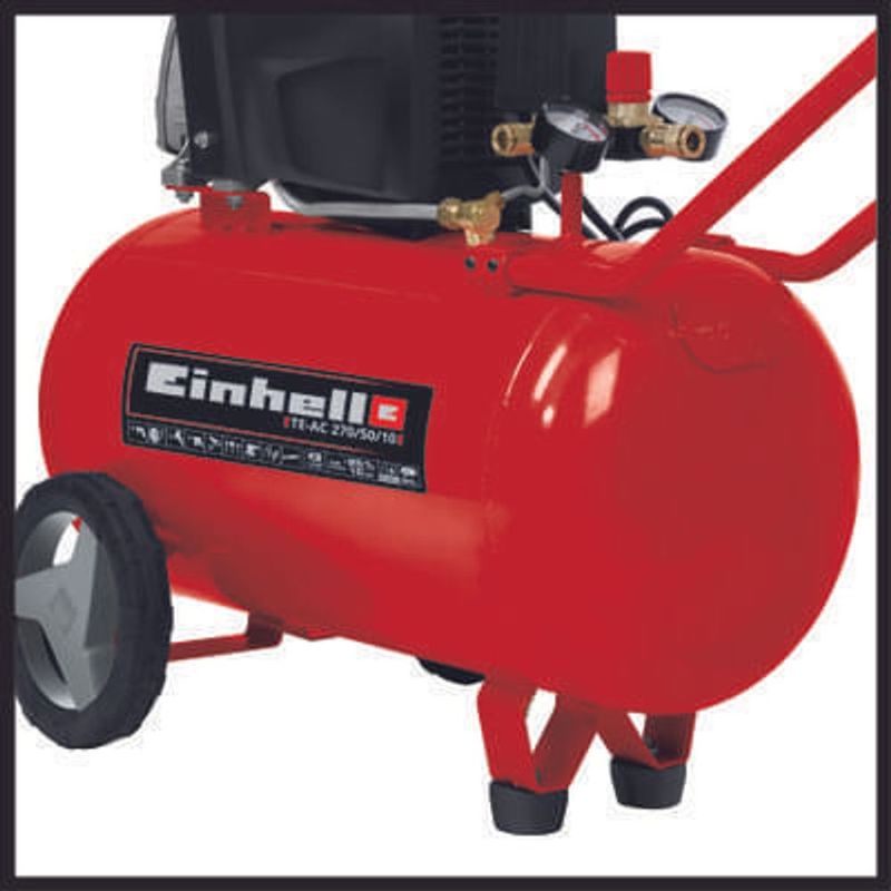 El Compresor 50 litros TE-AC 270/50/10 Einhell es un potente y robusto equipo destinado para altas exigencias. Gracias a los componentes de alta calidad y la lubricación con aceite, logra una vida útil muy larga. El nivel de aceite puede verificarse convenientemente a través de una mirilla. Por medio de un reductor de presión, la presión de trabajo de hasta 10 bares se puede ajustar a muchas aplicaciones.