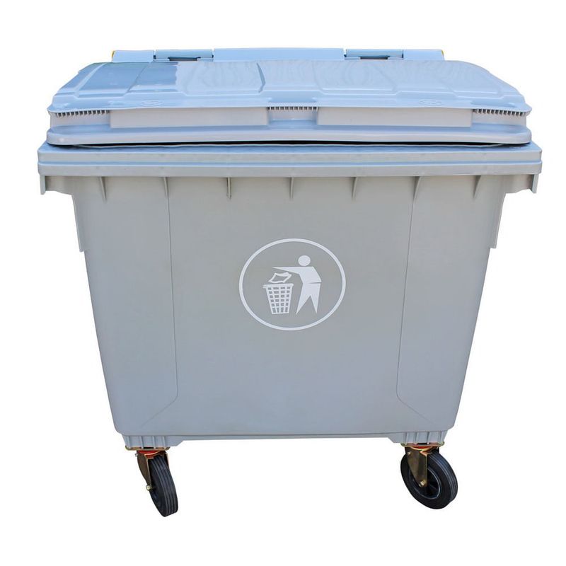 Contenedor Basura 1100 LTS Gris fabricado con polietileno de alta densidad (HDPE), con dos ruedas de alta resistencia que brinda mayor facilidad de traslado.