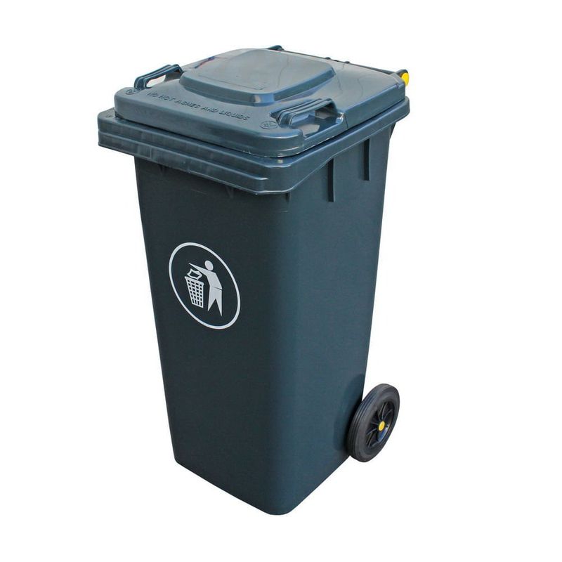 Contenedor Basura 120 Lts Gris fabricado con polietileno de alta densidad (HDPE), con dos ruedas de alta resistencia que brinda mayor facilidad de traslado.