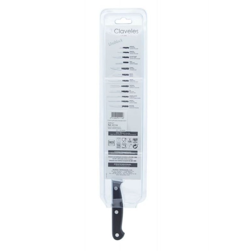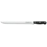 Cuchillo Jamonero Inox/unibl. 30cm #1114 especial para cortar jamón y otras piezas de carne. Cuchillo largo y delgado con hoja alveolada flexible y filo liso. Los alveolos facilitan el corte al crear una cámara de aire entre la hoja y el alimento evitando que este se quede adherido a la hoja, permitiendo cortar lonchas muy finas.