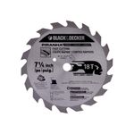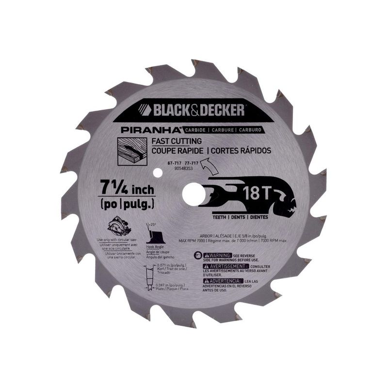 Disco Corte 7 1/4” 18 Dientes Black And Decker Acero modelo 77-717 PS con diámetro exterior de 7-1/4” (184 mm aprox) y diámetro interior de 5/8” (15 mm aprox).