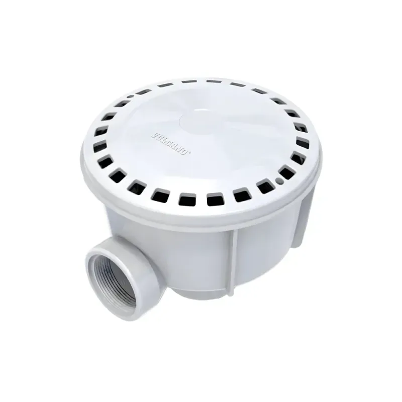 Toma de fondo Vulcano para piscinas de hormigón, con tapa segura de aberturas pequeñas y sistema antiremolino, sujeta con tornillos parker. Fabricadas en poliestireno de alto impacto, cuenta con 2 tomas de rosca hembra;. Ofrece una excelente acción de succión y drenaje, y destaca principalmente por su seguridad y versatilidad.