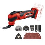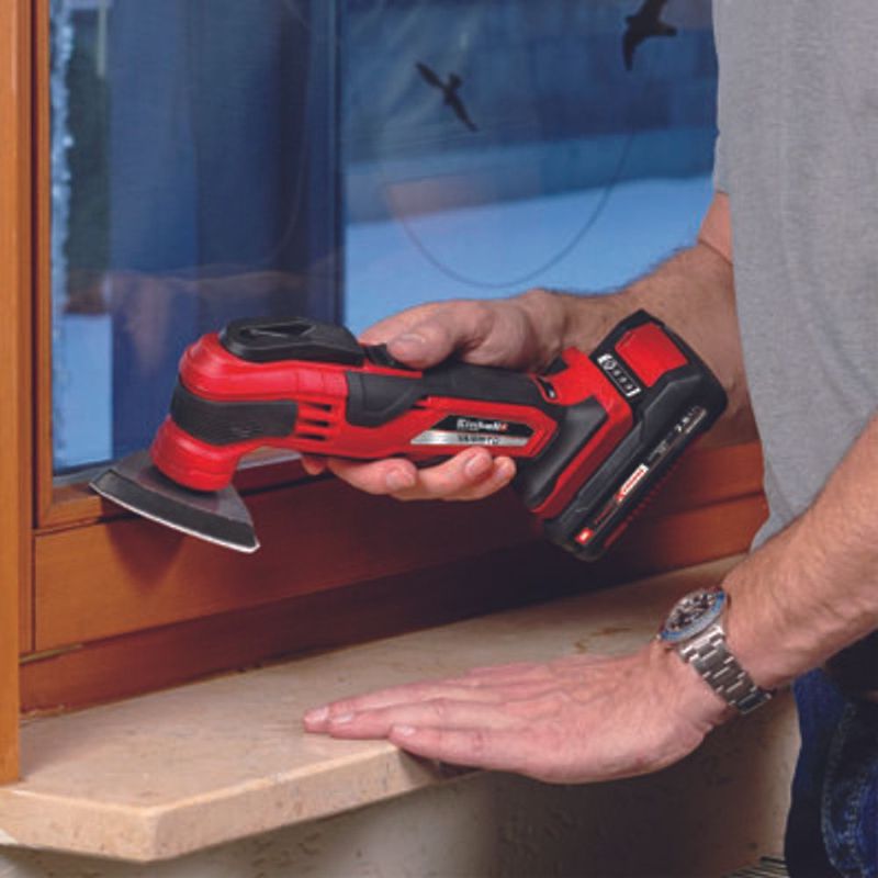13%La Herramienta Multifunción 18V Varrito Einhell supone una ayuda flexible y de calidad para realizar trabajos de desmontaje, renovación o saneamiento. Gracias a su amplio equipamiento, tareas como serrar, pulir o raspar se realizan sin esfuerzo. Como miembro de la familia Power X-Change, ofrece al usuario todos los beneficios de la tecnología de ion de litio de alta calidad de Einhell. La herramienta sin cable multifunción cuenta con una elevada calidad y diseño ergonómico, por lo que su uso en la práctica representa un tremendo alivio. El cierre de liberación rápida garantiza un cambio de accesorios sin necesidad de herramientas. Gracias al portaherramientas magnético, dicho proceso se puede realizar de forma cómoda y rápida.
