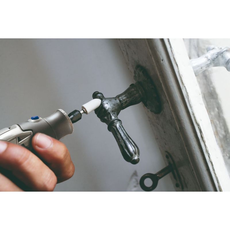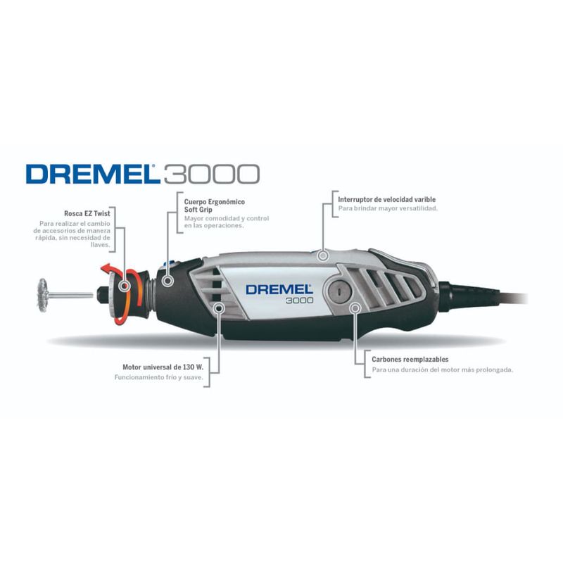 Contenido | 1 Dremel 3000 1 maletín con 1 adaptador empuñadura para detalle (modelo A577) y 1 escuche de accesorios con 1 fresa de tallado de punta redonda de 3,2mm para madera, metal, cuero, plástico, goma y cartón (modelo 191) 5 discos de corte de 23,8mm espesor de 1mm para metal (modelo 420) 1 disco reforzado de corte para duración superior de 31,8mm espessor de 1,1mm para metal (modelo 426) 1 piedra formato cuadrado de esmerilado de 9,5mm para metal, soldadura, remache y oxidácion (modelo 932) 1 cepillo de cerdas de nylon de 19,1mm para limpiar y pulir platería, joyas y metales preciosos (modelo 403) 1 cepillo de acero carbono de 19,1mm para remoción de oxidación y componentes eléctricos (modelo 428) 2 discos de fieltro para pulir de 12,7mm para metal, piedras y vidrio (modelo 414) 1 pasta para pulir y limpiar (modelo 421) 3 discos de fieltro para pulir de 25,4mm para metal, piedras y vidrio (modelo 429) 1 mandril vástago adaptador de lijado de 12,7mm con tubo de lija de grano grueso para madera, fibra de vidrio, plástico y goma (modelo 407) 2 tubos de lija de 12,7mm de grano grueso para madera, fibra de vidrio, plástico y goma (modelo 408) 2 tubos de lija de 12,7mm de grano medio para madera, fibra de vidrio, plástico y goma (modelo 432) 2 tubos de lija de 12,7mm de grano fino para madera, fibra de vidrio, plástico y goma (modelo 445) 1 broca de acero rápido de 3,2mm para madera, plástico, oro, bronce, latón y aluminio (modelo 150) 1 mandril vástago adaptador para accesorios de fieltro (modelo 401) 1 mandril vástago adaptador para discos (modelo 402) 1 llave 1 Manual |