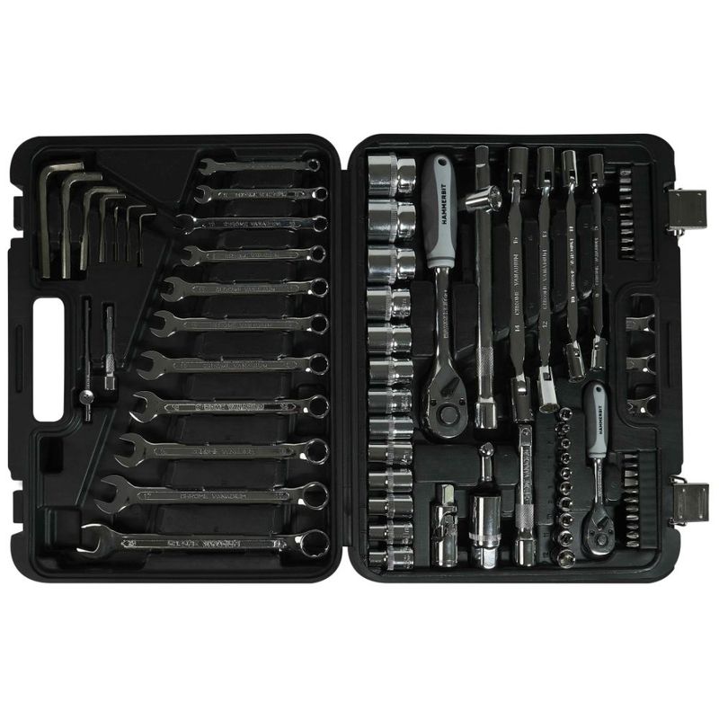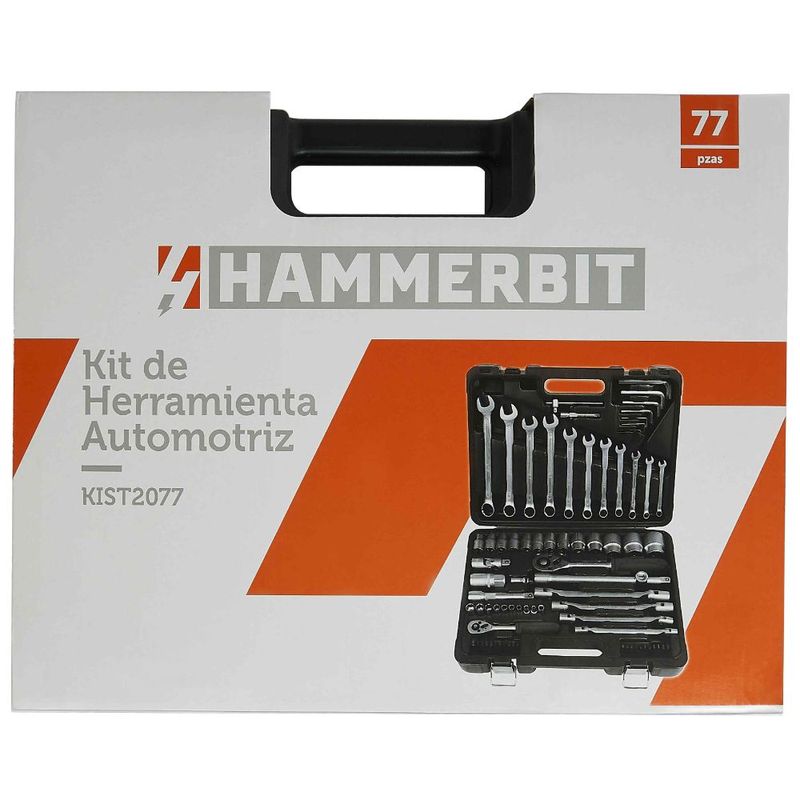 Kit herramientas automotriz 77Pcs Hammerbit incluye: Llaves 1/4″ y 1/2″, 9 Dados 1/4″: 4, 5, 6, 7, 8, 9, 10, 11, 12mm, 13 Dados 1/2″: 10, 11, 12, 13, 14, 15, 17, 19, 22, 24, 27, 30, 32mm, 21 Puntas: SL3, 4, 5.5, 7, PH0, 1, 2, 3, PZ1, 2, 3, T10, 15, 20, 25, 30, H2, 3, 4, 5, 6, Llaves Allen: 1.5 ,2.0 , 2.5, 5, 6, 8, 10mm, Llaves Punta Corona: 7, 8, 9, 10, 11, 12, 13, 14, 15, 17, 19mm, Llaves 8*9mm 10*11mm 12*13mm 14*15mm + Extensiones, Barras y Accesorios.