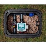 En la pared o enterrada en el suelo con las válvulas. Puede funcionar durante un año con una pila alcalina de 9V y, dos años con dos pilas de 9V. El tiempo de funcionamiento, las horas de inicio y los días de riego de cada zona se muestran en una sola pantalla. Circuito de inicio de bomba/válvula maestra.
